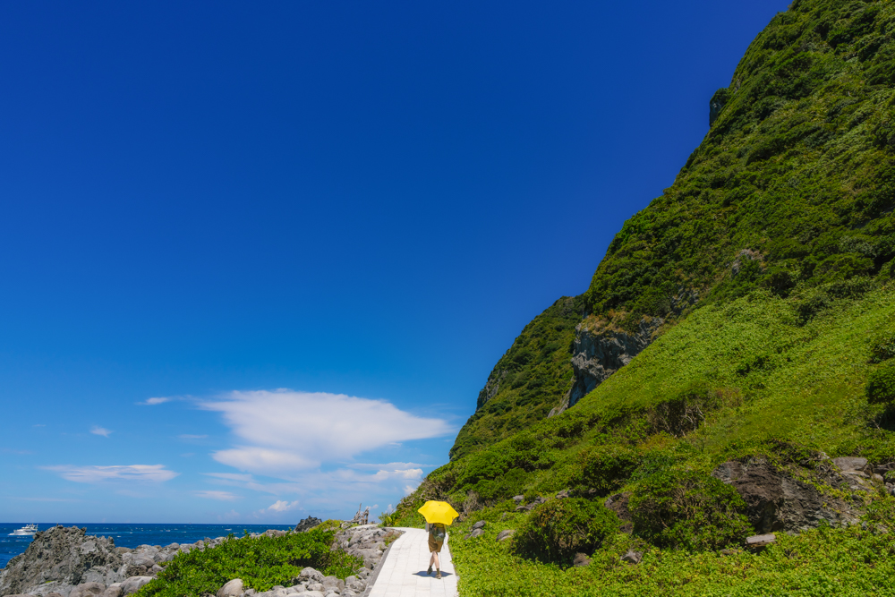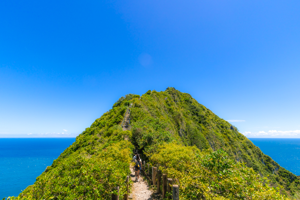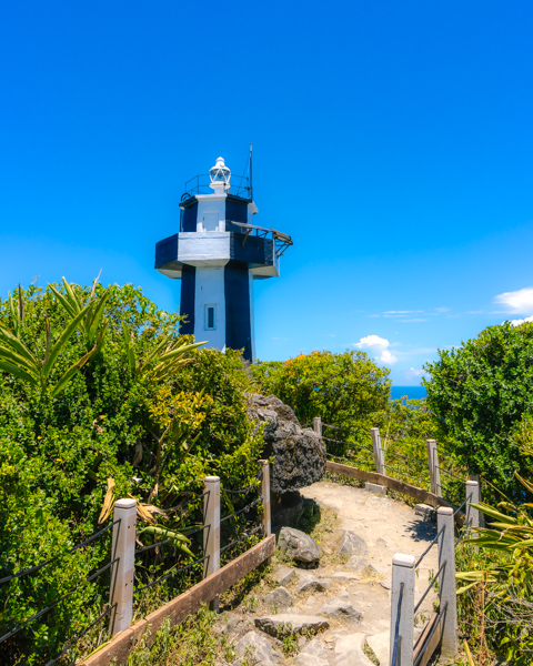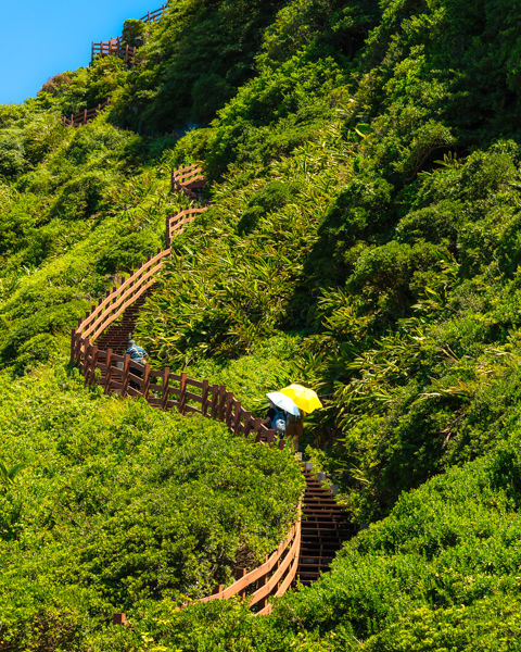 Both routes are there-and-back affairs, so after reaching the end of the coastal trail, we retraced our steps and began the steep climb up to the lighthouse. Wooden steps have been built onto the side of the slope, making the ascent less perilous (if not less tiring), and for the first 20min, tight zigzags offer some spectacular photo opportunities. Depending on the month, you might also find yourself surrounded by trailside blooms. From April to June, the elegant white trumpets of Formosa lilies sway in the wind, while from September to October, bright-orange spider lilies gild the slopes.