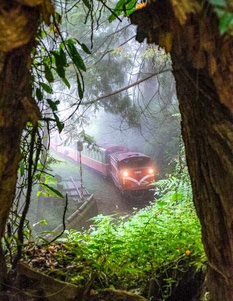 Starting off from Chiayi City (30m above sea level), the train trundles at a measured pace through sun-bleached farmland. Sugarcane and banana palms parallax past until, bit by bit, the plains give way to tropical greenery, the humid jungle breath permeating the carriage. As the engine begins climbing slightly, it grumbles, and the outside temperature dips. Subtropical vegetation interspersed with bamboo forest and mountain villages now lines the rails, and the shrill trills of white-eared sibia cut above the engine clamor.
