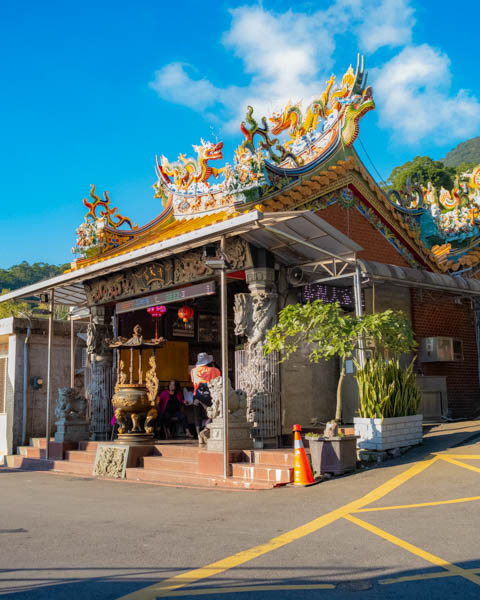 MRT Guandu Station is, as said above, the jumping-off point for Section 1. From here, signage bearing the TGT logo – a hiker approaching a summit with Taipei 101 in the background – directs walkers through the sculpture-filled grounds of the Taipei National University of the Arts. Emerging from the university’s rear gates, the route dives under the cover of trees, making its way onwards and upwards past an oversized grave site, a golf course, remnants of orange groves (the Tamsui area’s orange industry was ravaged by citrus greening disease in the 1980s), and irrigation canals until it reaches Qingtian Temple.