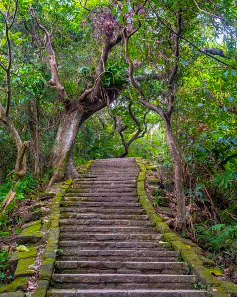 Skipping Sections 4 and 5 and flipping south, Section 6 of the TGT explores the ridgeline that rises like a protective arm cradling Xinyi District’s shiny high-rises. Starting from China University of Science and Technology, steps (yes, again) take you away from a built-up urban area back into the green. Unlike Yangmingshan’s mix of windswept grasses and hardy forest, the lower-elevation shrubbery here is lush and jungle-like, full of frilly ferns and trailing vines.