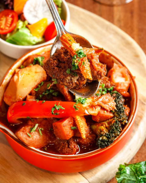 A veganified take on beef bourguignon is the store’s signature dish. The traditional beef has been swapped out for flavorful chunks of lion’s mane mushroom (a mushroom that hasn’t been told it’s not actually meat), which swim in a rich, umami red-wine gravy alongside sweet wedges of carrot, sauce-infused potato, and glistening, near-translucent slivers of onion. Other standouts include the deep-fried wontons – little parcels of herby cashew cheese, crisped to perfection, served on a slick of piquant tomato sauce – and the warm salad with organic kale and a creamy smoked-paprika hummus. It’s good, hearty stuff, and lends itself well to sharing with friends or family.