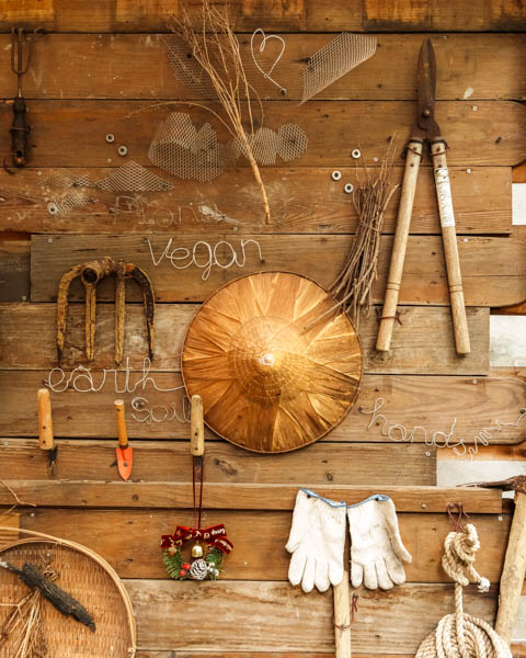 Opened in 2021, the eatery occupies a compact end-terrace property down a side lane in the quietly cosmopolitan Tianmu neighborhood, easily missable if not for the orange trim work brightening its exterior and the accumulation of curios crowding the small yard. Inside, the founder’s guiding principle of reciprocal nourishment between man and mountain shines through in every detail. The food’s local origins and the labor involved in creating it are anchored front of mind thanks to the decorative elements – preserving jars work their magic in plain sight, dried gourds form an organic curtain between dining and prep areas, and tools that have done serving their original purpose are given a second chance (like the toilet-roll holder fashioned from what looks to be an old paint roller).