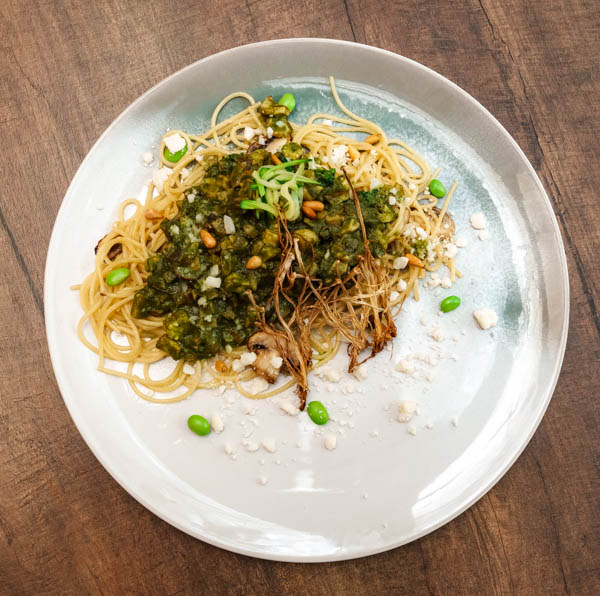 Also on the menu, you’ll find interesting oddities popping up in unexpected places. Gac fruit on pizza, winged beans in a stir-fry, olive oil in ice cream. One spaghetti dish makes particularly good use of ailanthus prickly ash – a flavor accent in some indigenous cuisines. It unmistakably gives lemony, peppery notes to the indulgent pesto sauce. Sweet potato sneaks into the dessert menu to assume the starring role as the main ingredient in a dense, nostalgic caramel pudding. It is not the kind of food that one can shovel down without thought – the flavors are complex, intriguing, and at times surprising, but the care that has gone into each decision is evident in every perfectly balanced bite.